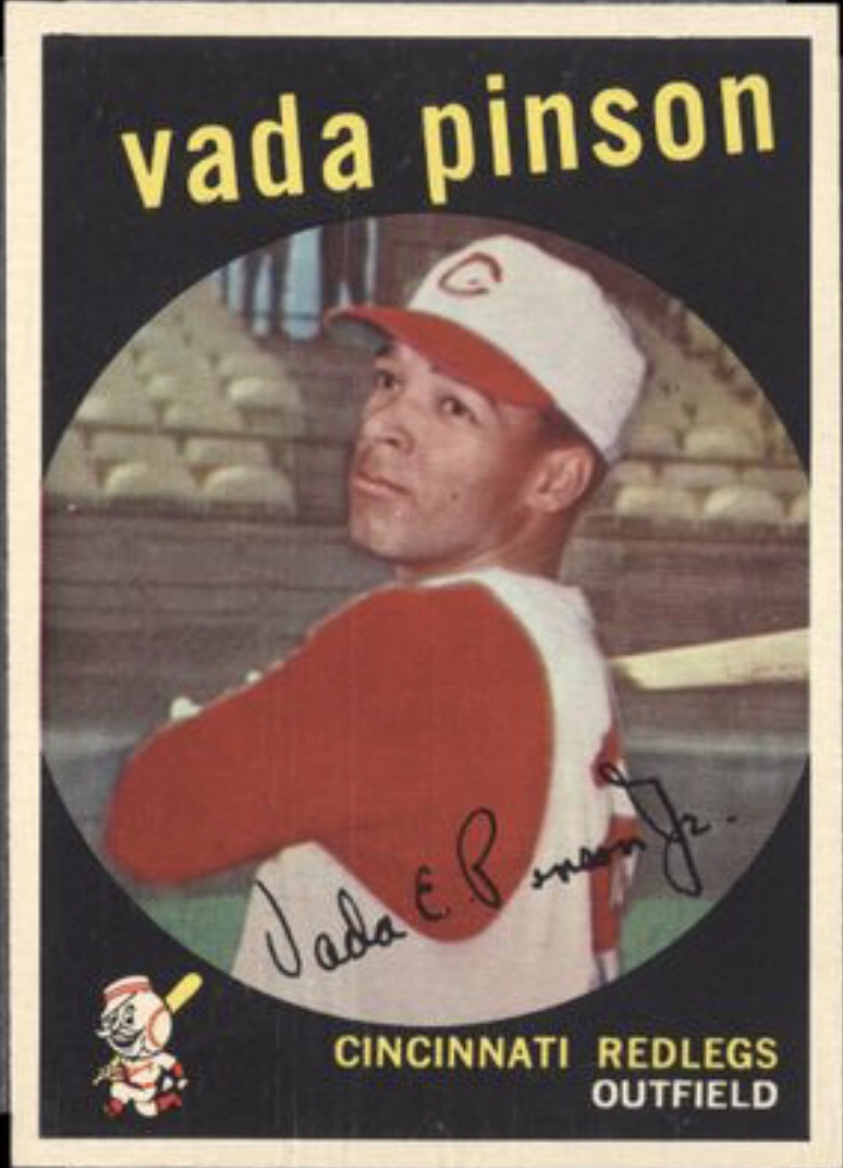 Vada Edward Pinson, Jr. (born in Memphis, TN on August 11, 1938 – October 21, 1995) burst into Major League Baseball straight out of high school with the Cincinnati Reds, and then led the National league in hits (131), doubles (47), at-bats (648) and plate appearances (706) in his second season. Unfortunately, because he had six at-bats (96) more than the minimum in 1958, he was ineligible for Rookie of the Year honors during his impressive “sophomore” year. Early on in Cincinnati, Vada played alongside Hall of Famer Frank Robinson and later Tony Perez and Pete Rose battling for power supremacy. He played the outfield for 18 seasons in Cincinnati (1958-1969), the St. Louis Cardinals (1969), the Cleveland Indians (1970-1971, the California Angels (1972-1973) and the Kansas City Royals (1974-1975). Always the offensive threat, Pinson led the National League twice in hits, doubles, and triples and once in runs scored. From his second to his second to last year, Vada had 110 hits or more each season and had yen years with 150 or more including four over 200 hits. Pinson also starred in the field as he posted a .981 fielding percentage with 5,097 putouts in 5,370 chances. He was named to four All-Star Games, appeared in the 1961 World Series loss to the New York Yankees and won a Gold Glove in 1961. Vada Pinson finished his playing career with a .286 career batting average, 2,757 hits including 485 doubles and 285 home runs, 305 stolen bases and 1,170 RBI. After his playing days ended, Pinson coached from 1977-1994 with the Seattle Mariners, Chicago White Sox, Detroit Tigers, and Florida Marlins.